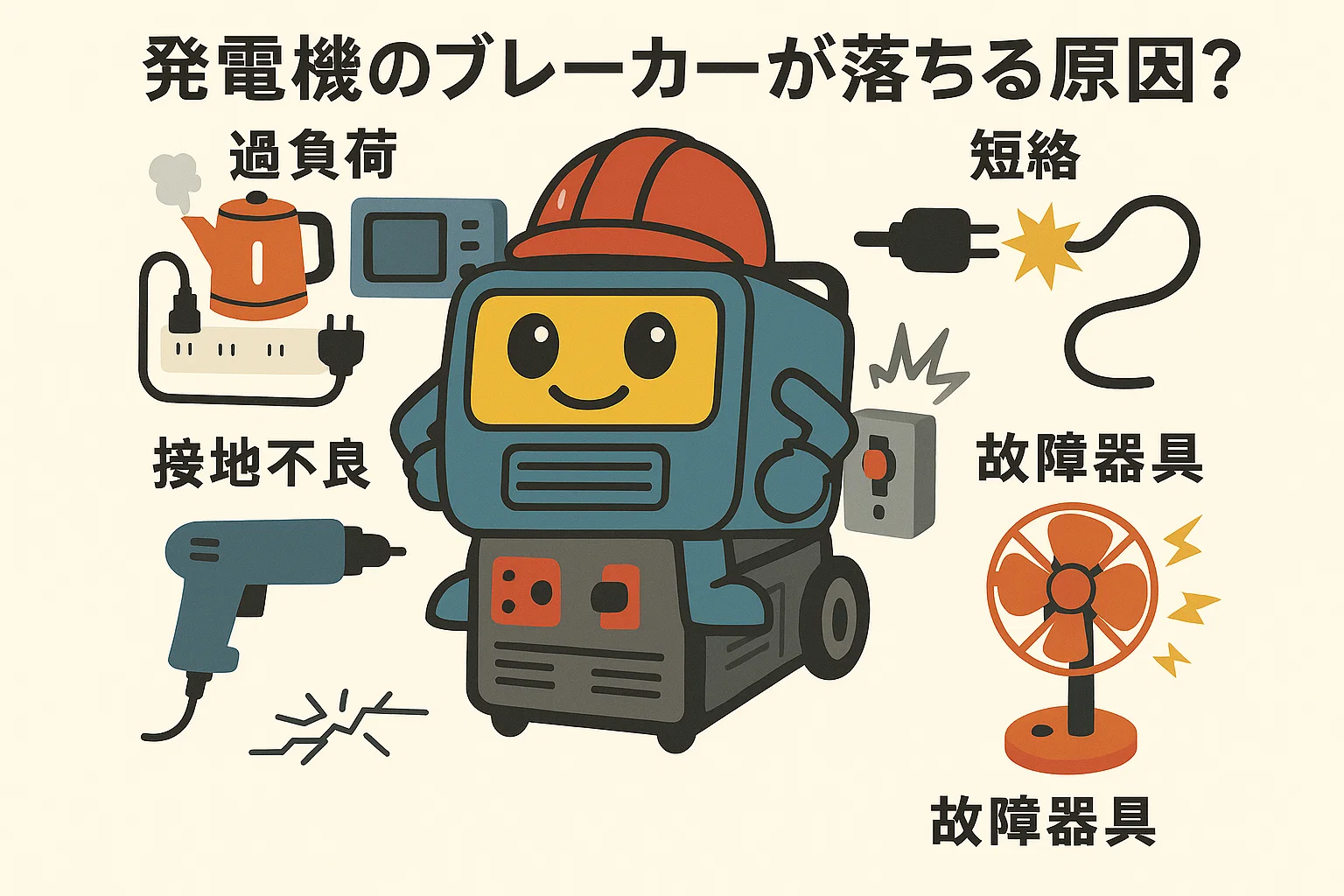 すべて 現場の「困った!」教えて発電くん歴史知識法律故障・修理 2025.11.12 現場の「困った!」 教えて発電くん 知識 故障・修理 教えて発電くん!:発電機のブレーカーが落ちる原因と対策(実務版) 2025.11.11 教えて発電くん 知識 教えて発電くん!サイマル発電機(同時出力発電機)ってなに? 2025.11.10 現場の「困った!」 教えて発電くん 知識 【教えて発電くん】水中ポンプ用の水位連動発電機|排水を自動始動・自動停止 2025.11.06 教えて発電くん 知識 発電機の周波数(50Hz/60Hz)って何が違うの? 教えて発電くん! 2025.11.05 教えて発電くん 知識 発電機選定で“必ず”おさえる10のポイント(やさしい版)教えて発電くん! 2025.11.04 教えて発電くん 知識 法律 非常用発電機の設置・運用をゼロから理解する 教えて発電くん! 2025.10.30 教えて発電くん 知識 インバーター発電機とAVR発電機の違い|イベント・照明は“適材適所”で選ぶ 教えて発電くん! 2025.10.29 教えて発電くん 知識 法律 建設現場で「10kw以上」の発電機を使うとき:経産省への申請・届出ガイド(初心者向け) 2025.10.28 教えて発電くん 知識 法律 災害時に発電機の申請は必要?「免除」って本当にあるの?【事後報告・10kW超の扱いまで完全ガイド】教えて発電くん! 2025.10.27 教えて発電くん 知識 法律 発電機に貼ってある「NEGA」ってなに?――1分でわかるマークの見方 2025.10.24 教えて発電くん 知識 教えて発電くん!力率ってなに?発電機選定で失敗しないための基本 2025.10.23 教えて発電くん 知識 法律 無資格者でも「発電機の主任技術者」になれる?10kW以上で主任技術者がネック…|教えて発電くん! 1 2 … 10 →